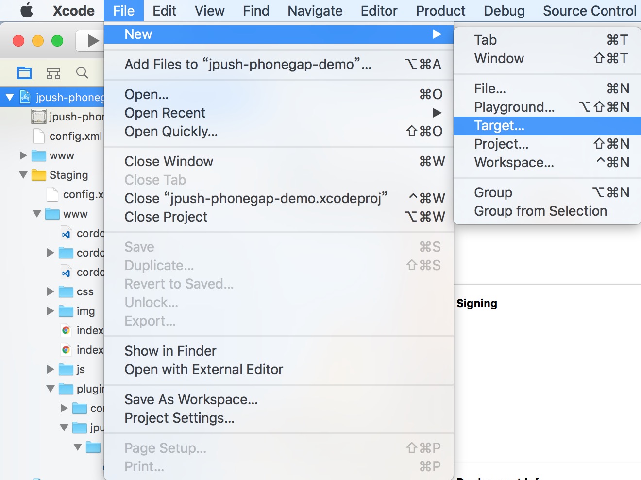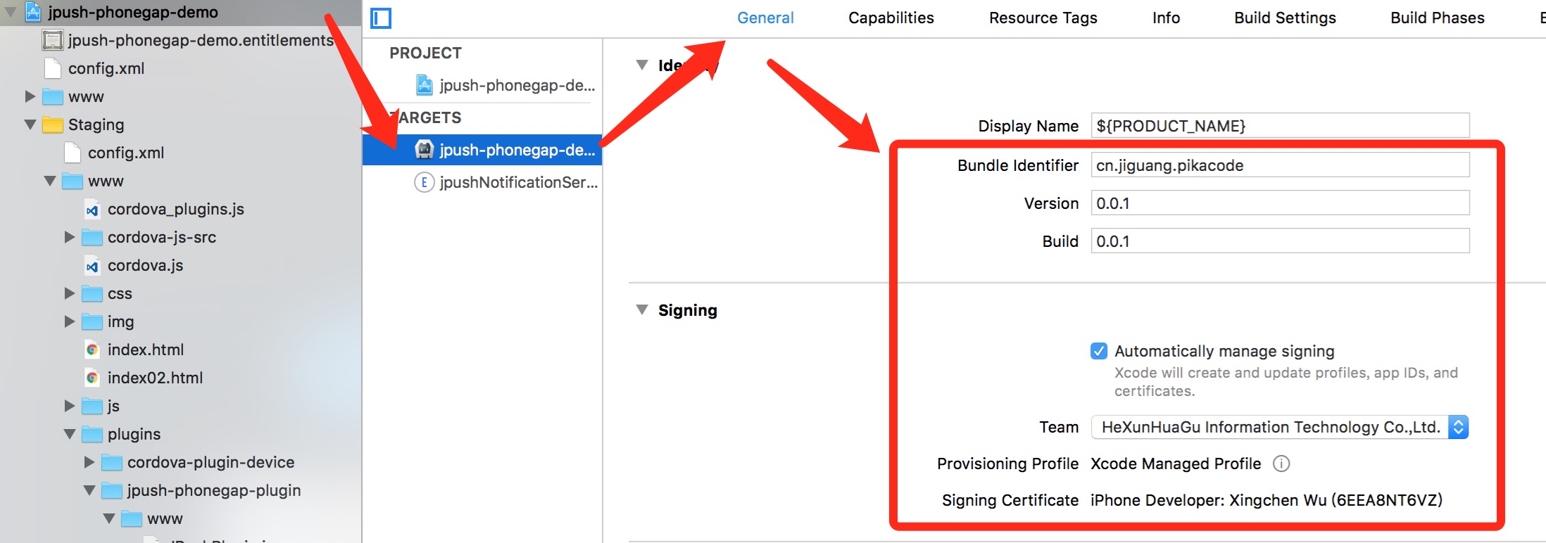 3.在 Xcode 工程目录左侧系统自动创建了 jpushNotificationService 文件夹及三个文件,下载本插件目录 jpush-phonegap-plugin/src/ios/notificationService/ 下的 NotificationService.hNotificationService.m 文件,全部复制替换对应文件内代码。